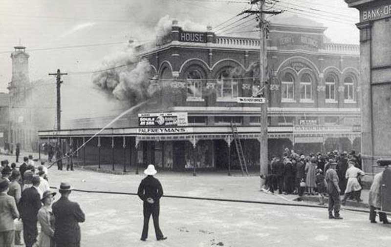 56-62 Wilson Street, Burnie. Above: on fire, 22 December 1938. Below: 2020