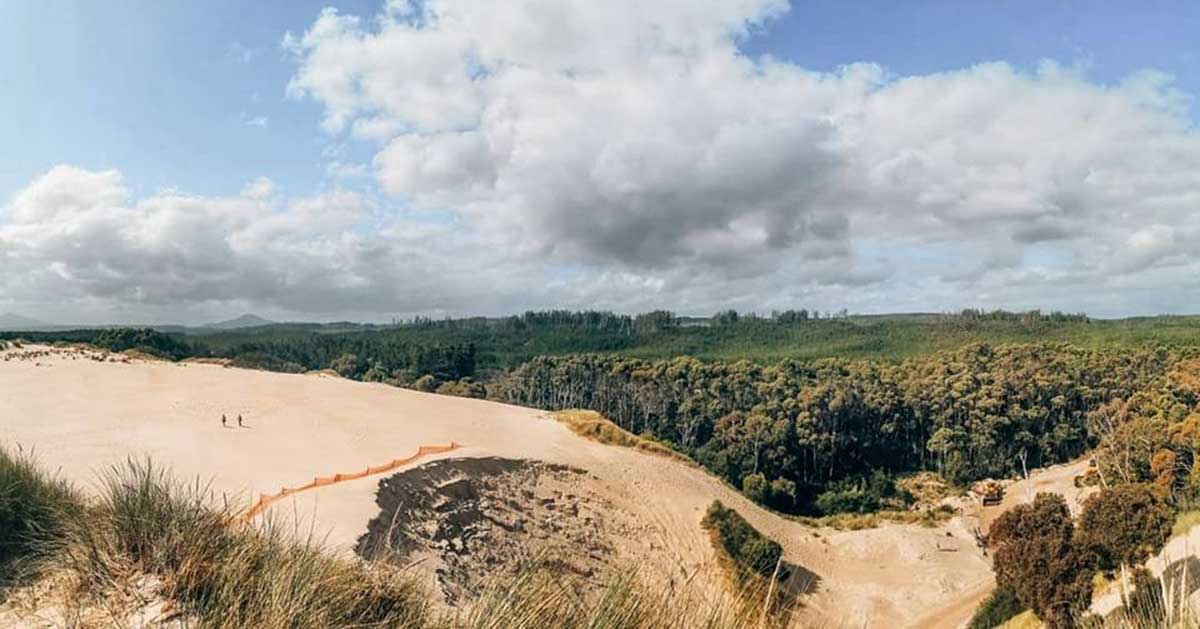 20 minutes drive south of Zeehan on the road south to Strahan is where you will find the largest moving dune system in Tasmania. Henty Dunes are a vast expanse of rolling white desert sand dunes extending several kilometres inland, its white hilly sand reminiscent of the Snowy Mountains. It is the last thing would expect to find amid the lush rainforest of Tasmania s west coast. Pine plantations have attempted to stop the migration of the dunes inland. The huge sand formations can be explored on foot or aboard quad bikes. Sandboarding is also popular.