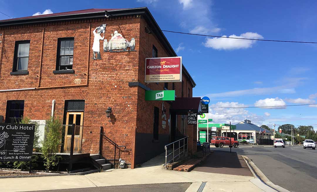 The Country Club Hotel, 19 Wellington Street, was constructed c. 1850. This large two storey painted brick hotel has a splayed corner with simple facade decorated by a stringcourse, brick lintel windowsills to the 12-pane windows, and a dentil course under the projecting eaves. Back in the days when motor racing was held on the streets of longford, th closest the racing circuit got to the town of Longford was the corner of Wellington and Union Streets - known as Pub Corner - that pub being the Country Club Hotel. The cars came along Union Street and turned right into Wellington Street, around the front of the Hotel. Being right on the racing circuit, the hotel was a popular drinking place among spectators. Today the hotel keeps alive its link with Australian motor racing history with memorabilia and photographs on its walls of races held here and the names of the legends of motor sport who raced here. You can enjoy a meal at the Chequered Flag Bistro.