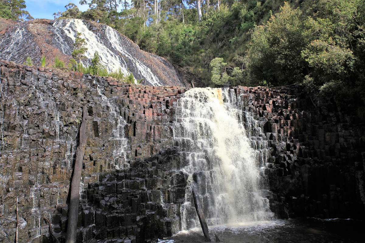 An unusual falls where 152 steep steps descend to the bottom of the cubic-basalt formed falls. These falls are very picturesque, particularly during the winter months. The track to the accessible viewing platform is beyond the falls. Four short walks lead to the base of these picturesque falls, its viewing platform, an old sawmill boiler and the nearby Big Tree.