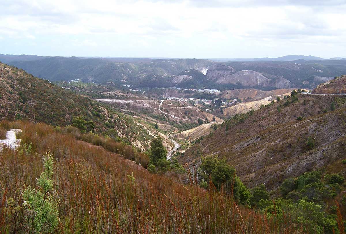 The whole area around the Iron Blow is much disturbed by old mine workings and by dumps of waste rock from the Mt Lyell mines. Beyond the car park is the West Lyell open cut which is on a mine lease and not open to the public. Quartzite and volcanics are the main rocks on Prospectors Ridge connecting Mts Lyell and Owen. The Heemskirk Range and Mt Zeehan are prominent mountains towards the northwest.