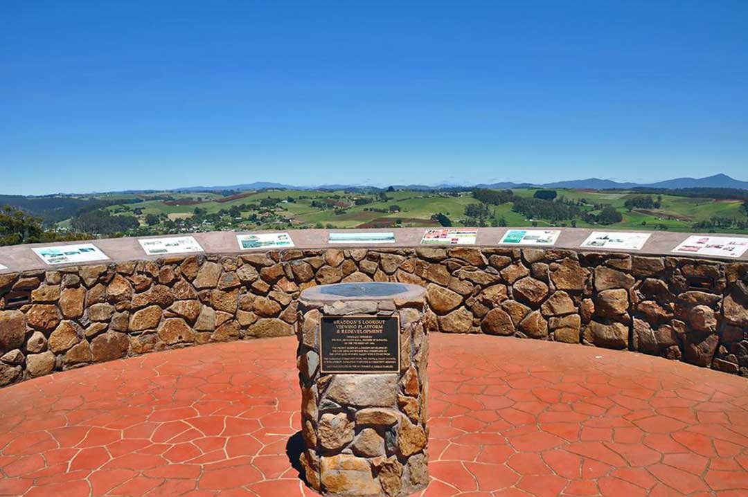 Braddons Lookout was named after Sir Edward Nicholas Coventry Braddon who, after a long career in the British civil service, arrived in Tasmania in 1878, entered state parliament in 1879 and was premier from 1894-99. The lookout stands on the site of Sir Edward Braddon's home. A secondary platform with a low fence improves the view for people in wheelchairs who may be unable to see over the stone wall that surrounds the main viewing platform. Eight plaques are dedicated to prominent local businesses, such as vegetable processing company Harvest Moon, while the others explore local history and historical figures such as Braddon himself.