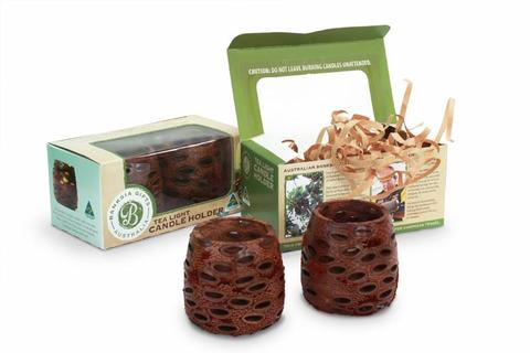 Hand turned from the seedpod of the Banksia Grandis tree of Western Australia, these T-Lite candle holders displays the wonderful texture and patterning achieved when the banksia nuts are turned on a lathe and the rough outside removed. When lit they emit a pretty dappled light and a soft glow. They come boxed with accompanying information, a picture of the Banksia Nut and instructions for use.