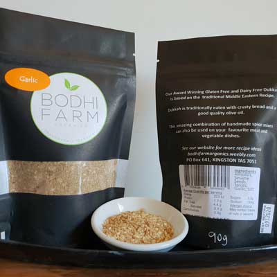 Handmade Tasmanian Dukkah - a middle eastern dipping spice made from a mixture of roasted nuts and spices and eaten traditionally with bread and olive oil. My award winning product is gluten and dairy free and can alos be used to coat meat and vegetable dishes. I have 10 different flavourating and have just recently won 2 more silver medals in the Melbourne fine food awards bringing the total to 7 silver's and 4 bronze medals in a short 2 years. My product is becoming widely used in Tasmania but also interstate. Bodhi Farm Organics