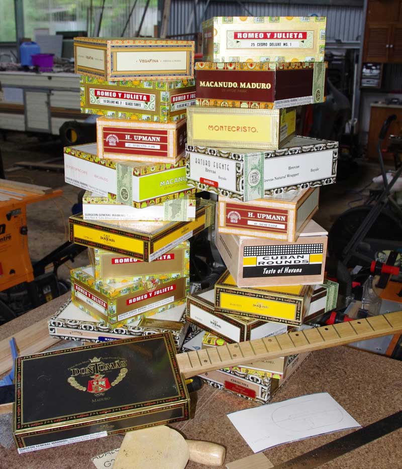 My guitars are predominantly constructed from cigar boxes sourced from the USA, where I buy in bulk to keep individual costs to a minimum. I try to keep my guitars as 'traditional' as possible, and give good value for money. Every guitar is hand built by me, and I use Tasmanian Oak for the necks. Medium nickel/silver frets are pressed into the necks, and the strings are D’Addario phosphor bronze.