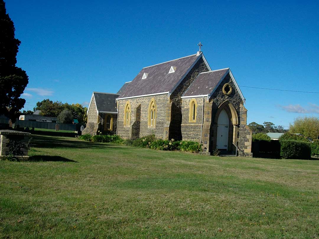 The bell, formerly in St Stephens in Smithton, carries the inscription "Kains 1817" and probably comes from the whaler "Kains" which was wrecked in 1835. A stained glass window at the rear of the church originated in Entally's chapel, and spent time installed in another nearby Church. It shows the crucifixion of Jesus and the Good Shepherd. The Church is a Gothic Revival design and somewhat scaled down from the original plans, the nave was built 10 feet (3.0 m) shorter, with some changed elements such as the entrance being built in stone on the west side rather than wood on the south. The church was consecrated in February 1973. The break in construction is marked by the different shade of stone used to finish it.