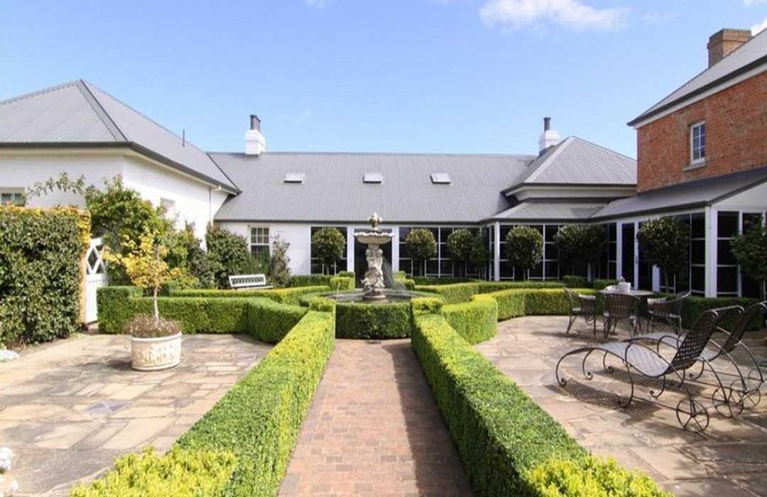 Brickendon Estate, RA 236 Wellington St, Longford: William Archer started his estate Brickendon shortly after Thomas in 1824 when his first cottage house was built. The main homestead, the delightfully proportioned two storey Georgian style residence with a pretty portico with iron pillars was built in 1829 when he married. The iron trellis portico was designed by architect nephew Thomas Archer of Woolmers and imported from England in 1857. Around the house William Archer planted hazelnuts, quinces, chestnuts, pears and medlars. Around his 30 acre paddocks he planted English Hawthorn hedges and Brickendon still has 30 kilometres of hawthorn hedge.