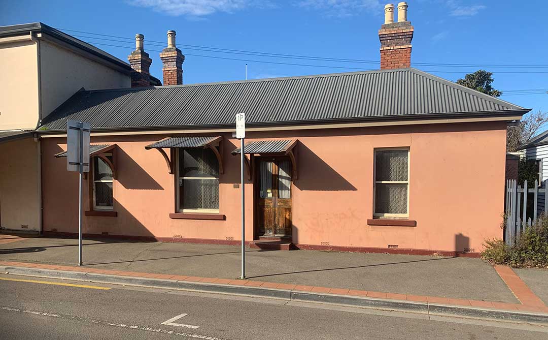 Berriedale, 44 Wellington Street: an unusual single storey cottage c. 1835 with a central front door with four panels, half sidelights, and a semi-elliptical fanlight. The Georgian homestead style is reflected in the projecting side bay and verandah. The chimneys have single corbells, and the roof is doubly pitched. The cottage has a two-storey addition c.1930s-40s. and a wooden outbuilding. Formerly the Berriedale Inn, it was opened by Peter Clyne in 1843 and purchased by James Hortle in 1850. It was later the home of dr Appleford, and then the home of the Carins family.