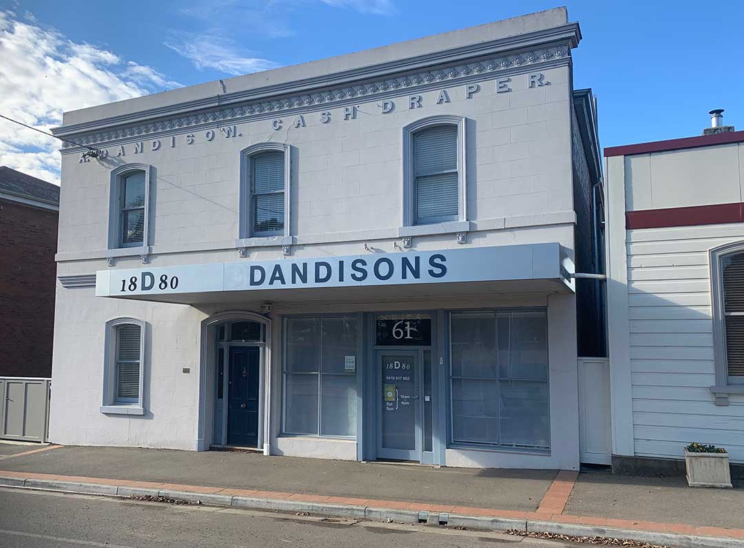 61 Wellington Street is a brick two-storey Victorian structure with stuccoed front face, including continuous sills/stringcourse and slightly arched topped windows with moulded surrounds. The awning is of special interest as it extends to the curb line and is supported with fine iron columns. The front door, with leadlights, side and transom lights, is also notable. Erected c. 1880, it was formerly A. Dandison's Drapery Store.