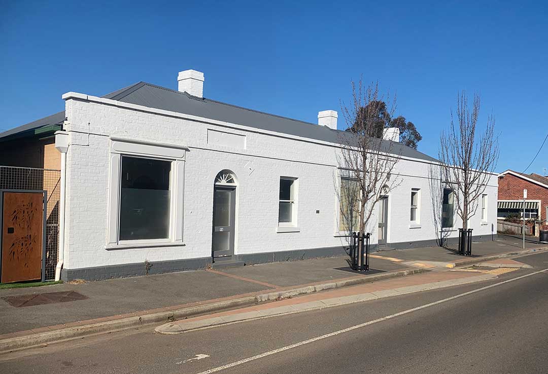 Bellamona, 2 Pakenham Street: built c. 1850. Set behind a picket fence, the brick and stucco cottage has a central door of six panels with trnasom light, flanked with 12-pane windows. The later timber verandah is embellished with cast-iron brackets and trim.