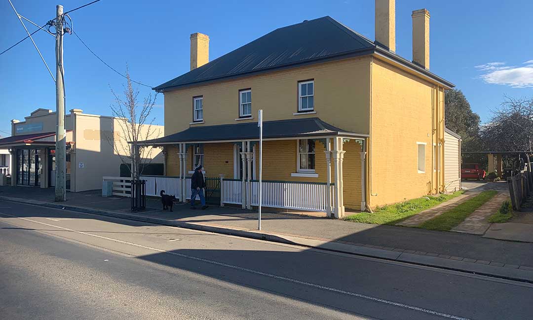 The Country Club Hotel, 19 Wellington Street, was constructed c. 1850. This large two storey painted brick hotel has a splayed corner with simple facade decorated by a stringcourse, brick lintel windowsills to the 12-pane windows, and a dentil course under the projecting eaves. Back in the days when motor racing was held on the streets of longford, th closest the racing circuit got to the town of Longford was the corner of Wellington and Union Streets - known as Pub Corner - that pub being the Country Club Hotel. The cars came along Union Street and turned right into Wellington Street, around the front of the Hotel. Being right on the racing circuit, the hotel was a popular drinking place among spectators. Today the hotel keeps alive its link with Australian motor racing history with memorabilia and photographs on its walls of races held here and the names of the legends of motor sport who raced here. You can enjoy a meal at the Chequered Flag Bistro.