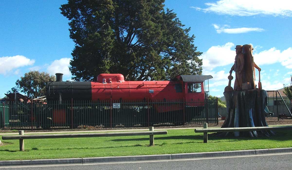A Tasmanian Governmenmt Railways 4-8-2 steam locomotive on display in Lions Park, 26 Main Road, Perth. The locomotive, H6, was built by Vulcan Foundry No. 5954 in 1951. H2 and H6 were the first TGR steam locos in the TGR red livery, which they acquired in 1956 for passenger train working working the 2nd. Division Western Line. H2 is currently under overhaul by the Derwent Valley Railway, New Norfolk.