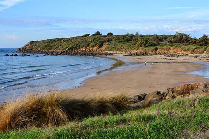 14 km east of Devonport via Bass Highway, Port Sorell Road and Pardoe RoadMoorland Beach extends east-northeast for 2.1 km between Pardoe and the low Moorland Point. There is a slight protrusion in the beach caused by wave refraction and attenuation to the lee of Wright and Egg islands, located 1-1.5 km offshore. The beach has a near continuous 150 m wide low tide bar, with low tide rips forming during higher waves, while closer to Moorland Point intertidal rocks and reefs are located in the intertidal zone.
