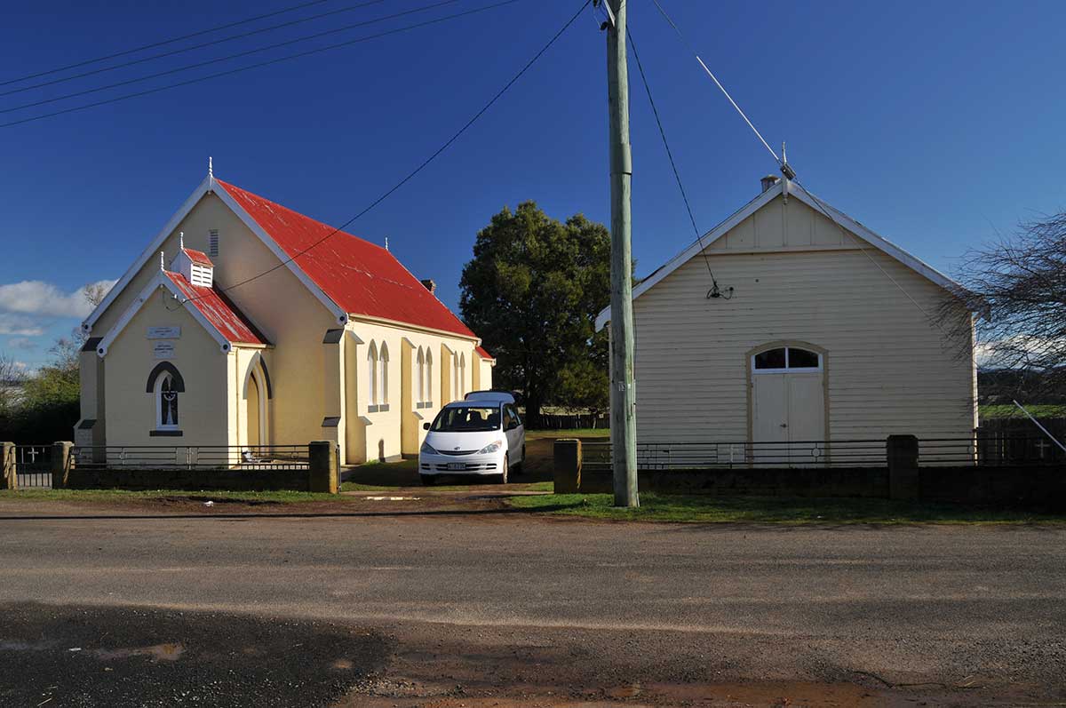 Whitemore is a small rural community in Tasmania's Central North. Its most prominent features are its 1864 brick church, adjacent to the original church building dating from 1857 - now a community hall - and the large workshop and offices of Shaw contracting, the most significant business in the town's history. Whitemore consists of a small cluster of buildings on either side of the only road, surrounded by farming land.