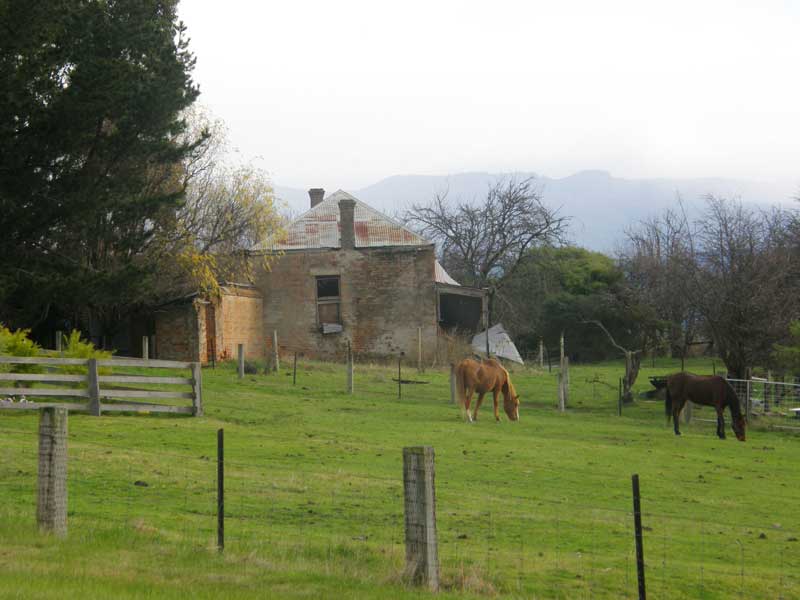 The village of Conara used to be very well known by travellers on the Midland Highway, though very few knew its name. What caught their attention was what they called "the disappearing house". Standing at the turnoff to St Marys at Conara, the so-called “Disappearing House” earned its name by the illusion of its sinking into the ground as travellers approached along the main road from Hobart to Launceston, due to the peculiar conformation of the landscape.