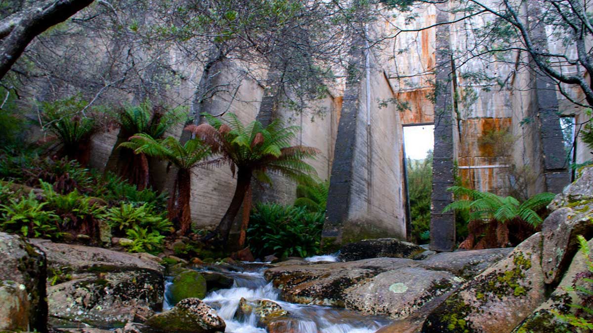 Mt Paris Dam (16.8 km from Derby, 7 km from Weldborough), on the Mt Paris Road, is the only surviving pillar and slab dam in Tasmania. Originally named the Morning Star Dam, it was built across the Cascade River using only shovels and wheelbarrows in 1937 and was connected by an 11 Km water race with the Mt Paris Mine. The mine closed in 1970 and the dam fell into disuse. In 1985, a hole was blasted into the 16 metre high wall to release the water. In the middle of the dam, most of the vegetation has now grown back, the only indication it was ever any different is the dam wall which still rises starkly before you in the middle of the bush.