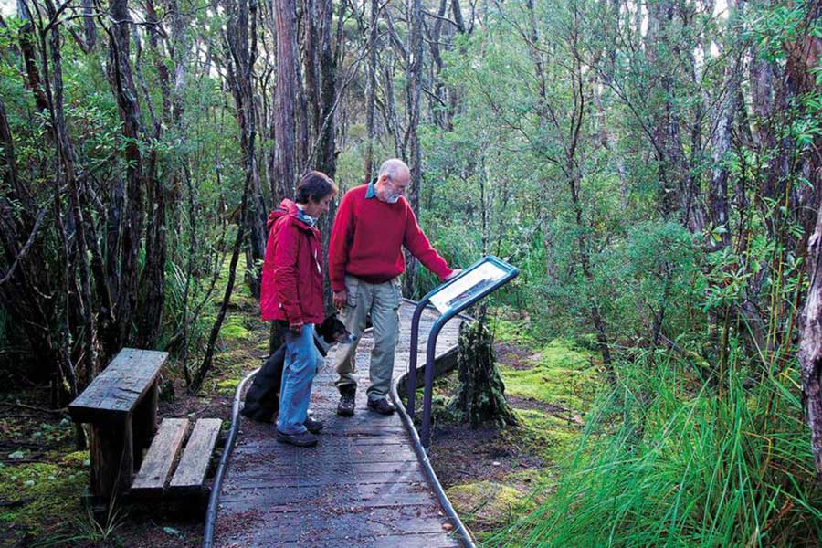 The hand-built Blue Tier Giant Track weaves unobtrusively through the landscape and divides into the Big Tree trail and a longer circuit. In addition to its stunning valley and fern-forest views, the loop track passes a number of striking tall trees, such as the ‘Cradle Tree’. It also crosses a stone-arch bridge over an agricultural water race.