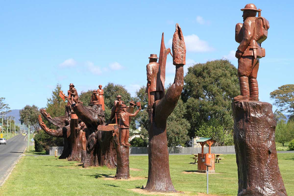 Though off the highway, the small town of Legerwood near Ringarooma is worth a visit. Legerwood was put on the map in 2005 when Eddie Freeman from Ross sculptured the trees here as a memorial to World War I soldiers with his chainsaw. The tree carvings are set in a quaint little public park with excellent public toilet and picnicing facilities, just a short detour off the main highway. There is a plaque giving the history of the men at the base of each tree. Surrounded by dairy farming and timber harvesting, nearby Ringarooma is on the edge of the mountains of the North-East, with Mount Victoria and Ben Lomond rising to the south.