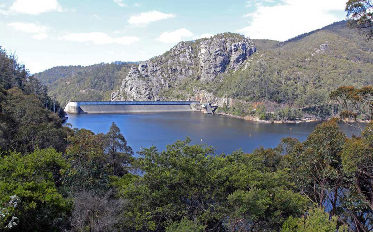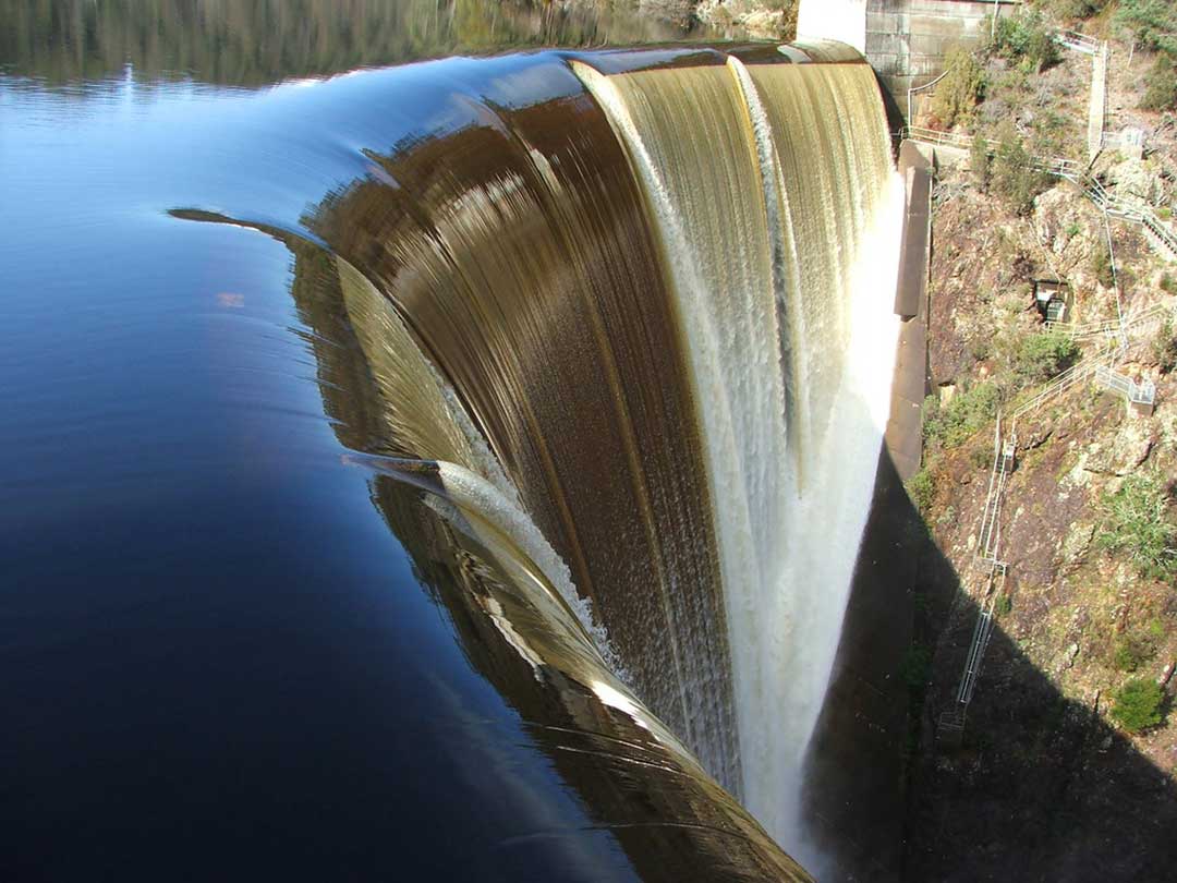 The Devils Gate Dam has an overhanging crest that allows flood water to freefall to the river bed, with up to 2000 tonnes of water falling per second during an extreme flood. It is one of the thinnest concrete arch dams in the world. It was completed by the Hydro-Electric Commission in 1969 and is 84 metres high. The narrowness of the gorge and the computer-aided design of its double-curvature shape enabled engineers to minimise the volume of concrete and hence the cost of the dam. Flood waters falling freely from the crest strike concrete slabs carefully positioned on the abutments to prevent undermining of the dam by erosion.
