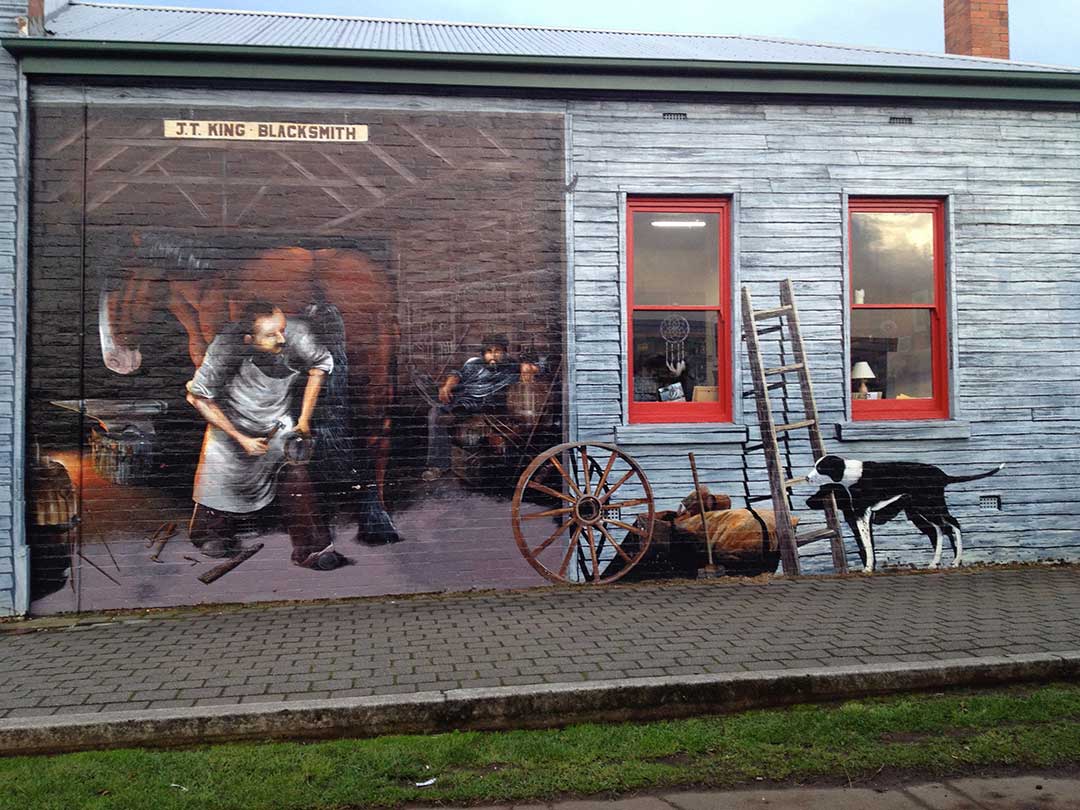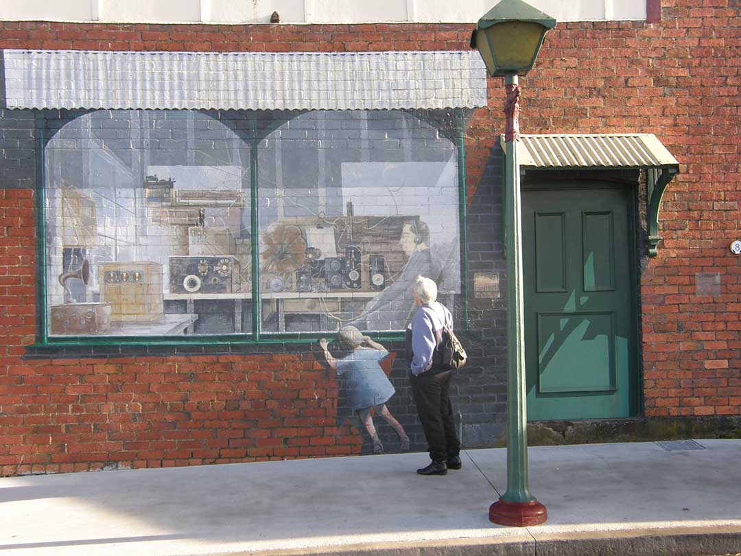 The murals provide genuinely fascinating insights into the local community, its history and culture. A near-perfect example is the mural, The Missed Opportunity (above). Painted by Cheyne Purdue in 1990 and located on High Street it depicts a moment in the town's history when "In 1926 Jesse and Nellie Slater's old business friend, Mr Coles of nearby Wilmot, came into the shop. He tried to persuade them to invest money in a new company, G.J. Coles P/L, which his sons were forming in Melbourne. The new concept was of open display shopping, with nothing selling for more than 2 shillings and sixpence. Mr & Mrs Slater couldn't be persuaded to invest. The success of G.J. Coles P/L is legendary ... Slater's Country Store is still on the corner of Main and High Streets."