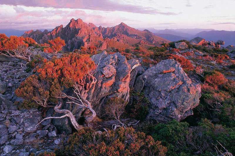 Despite the low elevation, the landscape is surprisingly rugged and the effects of recent ice ages are evident. The scenery is so good that bushwalkers ignore mountain ranges that in any other part of Australia would be ranked amongst the best. Most head into the Tasmania Wilderness World Heritage Area. This is comprised of four large national parks, South West, Wild Rivers, Cradle Mountain and Walls Of Jerusalem, plus some small reserves, and covers 20% of the entire state. There are many other parks and reserves elsewhere in the state that are also worth visiting.