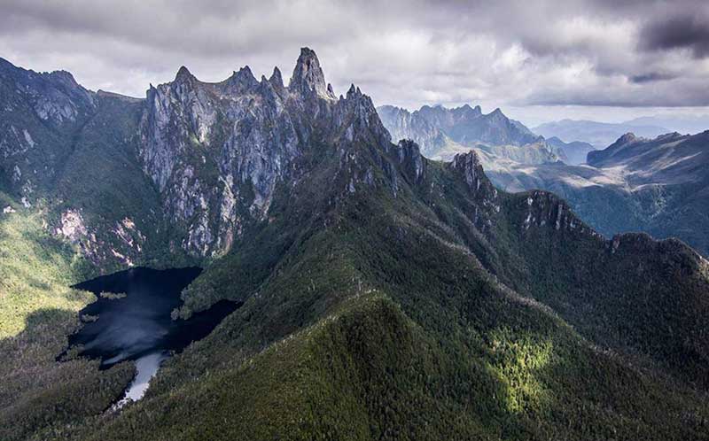 The Western Arthurs is a small mountain range in South West Tasmania. The range was heavily glaciated during recent ice ages and is an almost continuous series of steep headwalls. While it is only 15km long, the range contains 22 major peaks and 30 lakes. The scenery is spectacular with glacial tarns surrounded by towering cliffs. The range is the best example of glaciated scenery in Tasmania (and Australia). Along the range there is an established walking route. This follows the serrated crest of the range from one end to the other. The route follows a complicated path and at first glance it looks highly improbable that anyone could pass through.