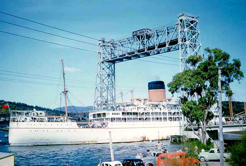 The Gothic, which brought the Queen and Duke of Edinburgh to Hobart in 1954, passes under the lifting arch of the bridge. Photo: Trams Downunder Archive