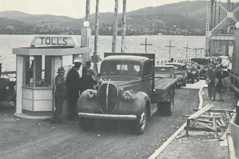 The Bailey bridge was built and opened in 1943, however it varied from Jacobs' design by having a lift span on the eastern shore to allow vessels to pass upstream, and a floating arch section of two reinforced concrete sections anchored to the abutment and lift span. The lift span weighed 350 tons and could be raised 46 metres in two minutes. From 1943 until 1948 a toll of 2 shillings (20 cents) applied to cars until 1946 when it was reduced by 1 shilling. Utilities were charged 1 shilling 6 pence (15 cents) and passengers over the age of 14 were charged 3 pence (3 cents).