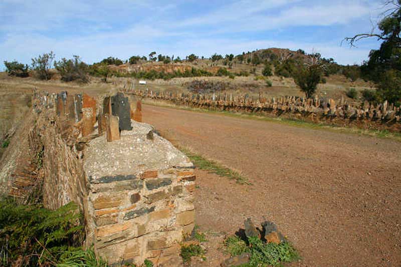 This field stone bridge sppears to be dry stonework. Its side walls, being of random rubble, make it more a causeway with small arched culvert. It features stone buttresses on west side beside a central channel. The lower side of the west wall (sloping side) was strengthened during 1920's. The bridge parapets with large and small upright stones inspired the bridge's present name. The bridge is located on the Tasman Highway near Swansea.