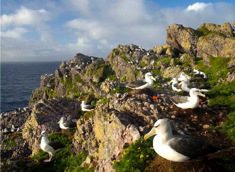 Albatross Island has many delights but none come near the feeling of awe and inspiration of walking amongst the thousands of nesting birds. The Albatross is strong, confident and totally in control of its environment. The island has four caves, two are concealed by tunnels and easily missed. These caves extend up to 60 metres with ceilings of 15 metres, large enough to accommodate the hundreds of penguins that come ashore to rest there each night.The centre of the island is cut lengthways by a deep gulch which runs through the short axis; one of the caves runs through the long axis. The cave is usually occupied by a few Albatross that have become trapped. It was in this cave that early sealers slaughtered thousands of Albatross in the 1870's. The island has steep cliffs on all sides, and these have afforded the Albatross some protection. They nest on the top of the highest cliffs. The island once boasted over 12,000 seals but these were less fortunate.