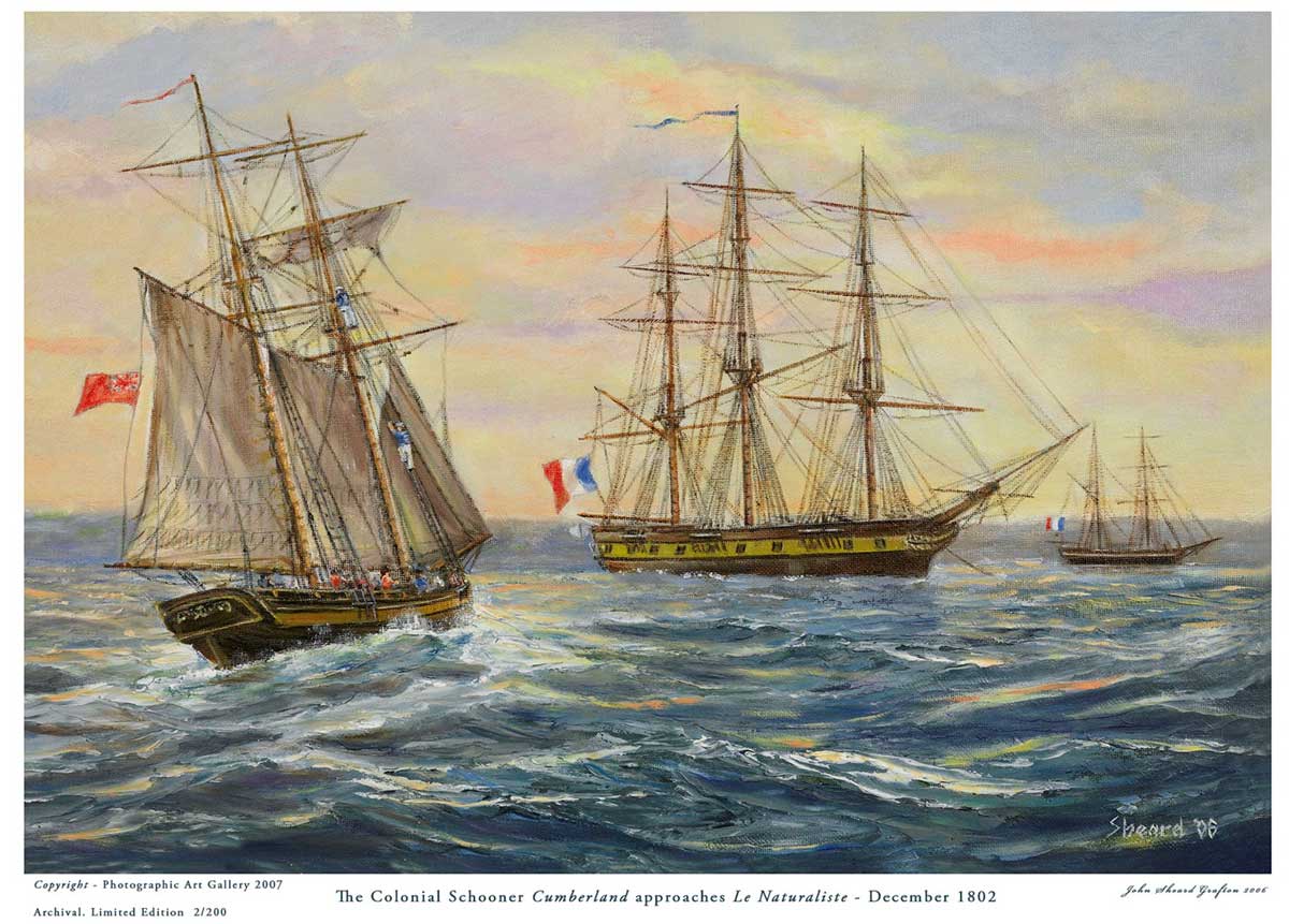 Luckily, the French, who numbered nearly one hundred, compared to the 17 of Robbins and his crew from the Cumberland, treated the incident with ridicule and not with force. Baudin tartly remarked to Robbins that he had ‘no intention of annexing a country already inhabited by savages’. Baudin then sent Pierre Faure, his hydrographer, on a circumnavigation of the island, naming various places whilst Grimes did much the same in his wake.