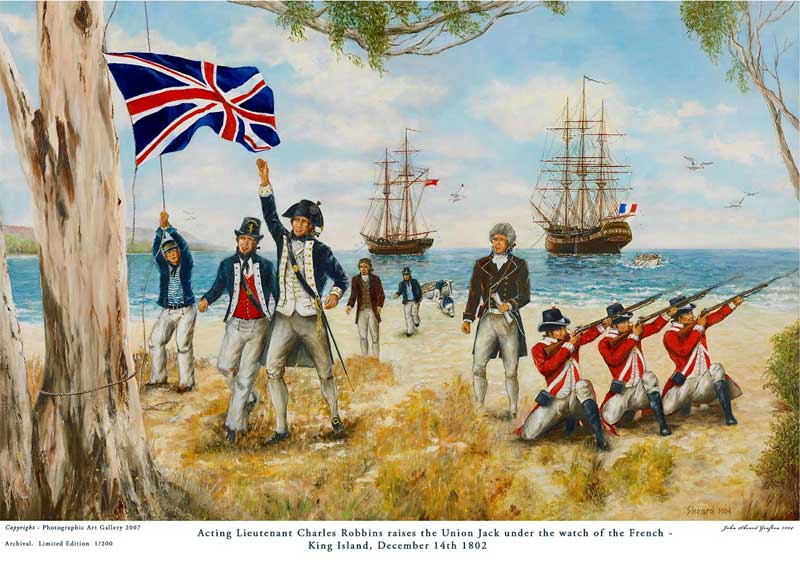 On 13 December 1802, Robbins entered Sea Elephant Bay, King Island, to find Baudin’s ships at anchor off shore near the present site of Naracoopa. Panic struck, Robbins launched a long boat with a party of men and made a dash for the shore. Ribbins delivered the despatch to Baudin, pulled out a Union Jack and proceeded to claim Van Diemen’s Land for England. This was the first occasion the newly-created Union Jack was flown in Australia and Robbins made a shambles of it.