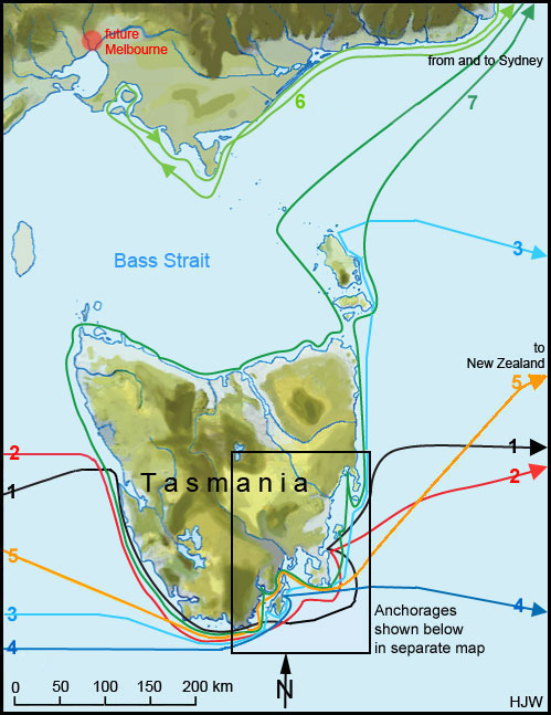 The following are the major pre and early colonial maritime explorers of Van Diemen's Land (Tasmania). Others, like Captain John Henry Cox (July 1789), Captain William Reed (1798), Captain William Douglas Campbell (1798) and Captain John Black (1801) made sightings and went ashore - some even named coastal features - but did not significantly contribute towards the exploration and charting of the coast of Tasmania, and for that reason their exploits are not detailed here.
