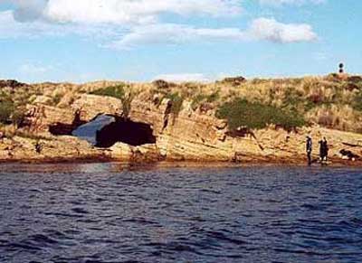 Arch Rock is small sandstone island at Ninepin Point Marine Reserve a few kilometres east of Verona Sands, named for the cave that forms an arch in its centre and it is a notable geological feature as well as being an interesting dive. Diving in the tannin waters of the reserve is an iconic Tasmanian dive experience. The waters of the Reserve are subject to high levels of tannin from the nearby Huon River. Less dense tea-coloured fresh water overlays the colder sea water and filters out light, which leads to some marine life being seen in much shallower waters than otherwise.