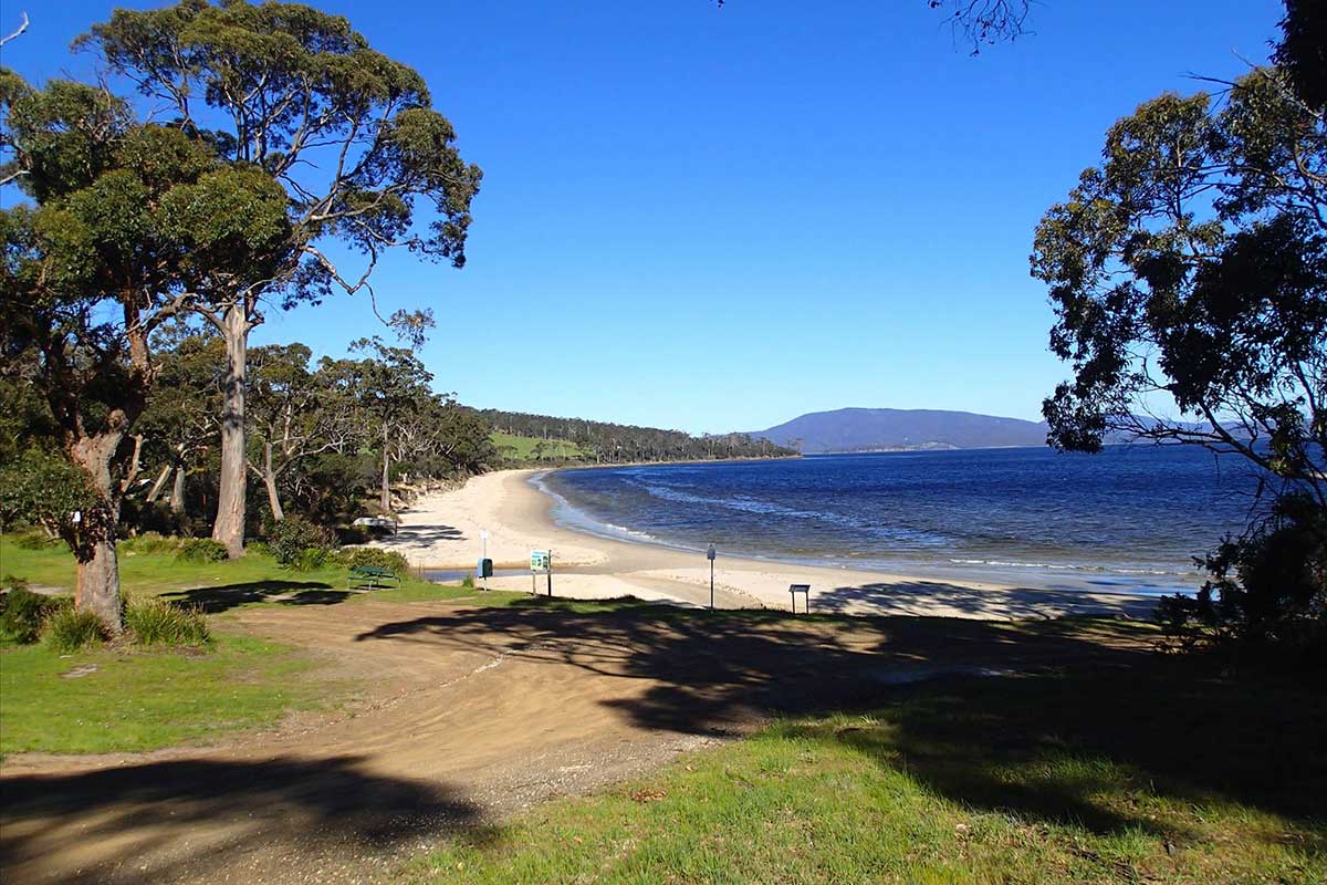 Garden Island Bay is a 3 km wide irregular embayment that faces south past Garden Island into D'Entrecasteaux Channel. Garden Island Sands is located on the bay at the mouth of Garden Island Creek. It has a 400 metre long beach bordered by the creek. Randalls Bay lies 1 km to the west in the centre of Garden Island Bay. The bay has a 750n metre long beach. A camping and picnic area with toilets are located at the western end of the beach adjacent to the mouth of Randalls Creek.