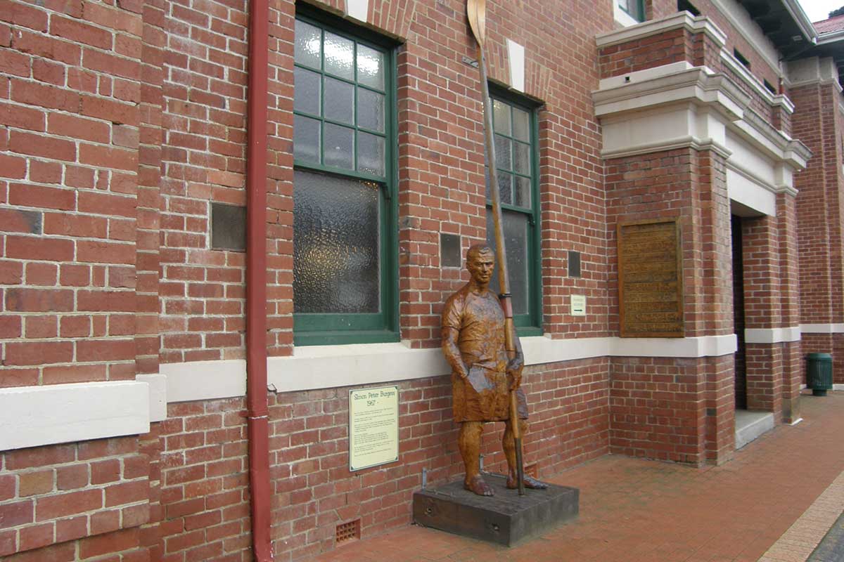 The Forest & Heritage Centre, which details the history of the timber industry in the area, is located in Geeveston. Outside the Centre is one of many chainsaw-crafted statues of some of the region's memorable personalities dotted around town. A sportsman who has been honoured this way is dual silver-medal winning Olympian, rower Simon Burgess.