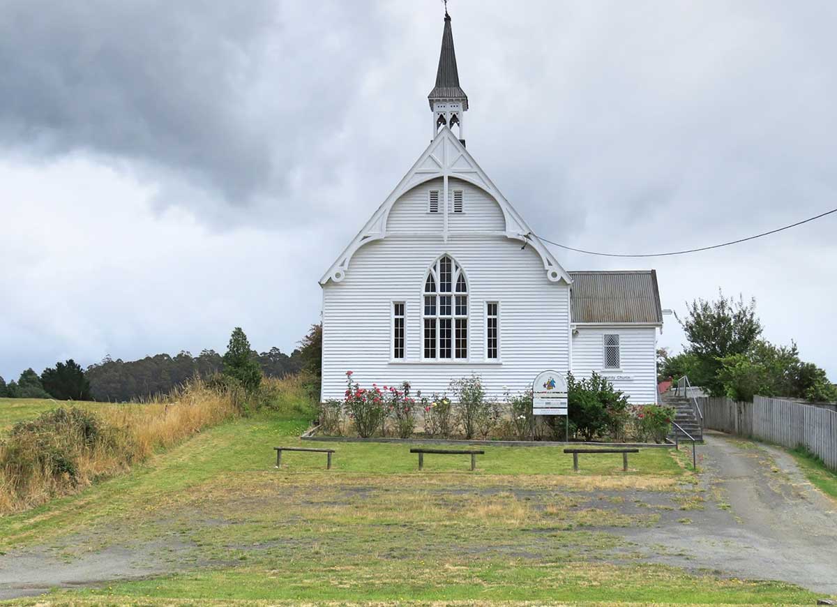 The Geeveston Community Church (1880s) is a weatherboard Victorian Carpenter Gothic church building, and is the most prominent building on the highway. It is notable for its tiny steeple which seems out of proportion to the rest of the building. The single storey weatherboard church building features a steeply pitched gabled roof, timber fretwork to the bargeboards, a large segmented pointed arch window and a bell spire. Location: Huon Highway, Geeveston.