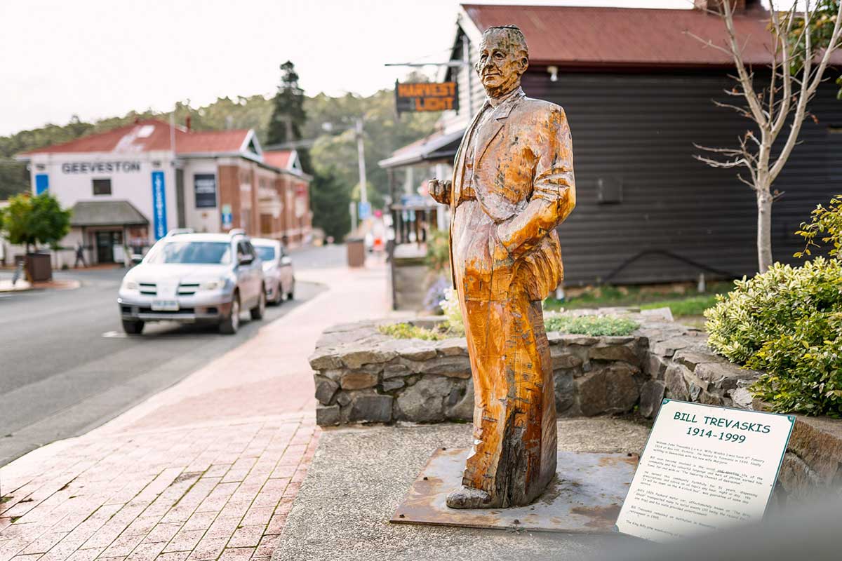 A small timber milling and apple growing town, Geeveston is the gateway to the rugged Hartz Mountains National Park. Some of the tallest hardwood trees in the world (up to 95 m high) grow here. Geeveston is also the stepping off point for the Tahune AirWalk and cruises on Port Huon. The town's most overt symbol (it is impossible to miss as you drive through town on the Huon Highway) is the huge trunk of a Swamp Gum (eucalyptus regnans) logged in Arve Valley on 10 December 1971. A sign on the side of the trunk proudly declares that the length is 15.8 m, the girth 6.7 m, it weighs 57 tonnes and its volume 56.7 cubic metres. Kermandie is a southern area ofGeeveston that runs along the side of the Kermandie River. The name preserves the name of Huon Kermandec, second in command of the expedition in 1792 by the French Admiral Bruni D'Entrecasteaux.