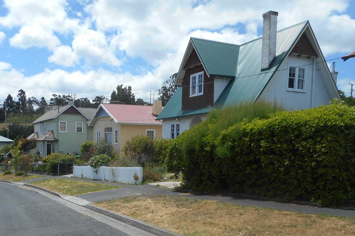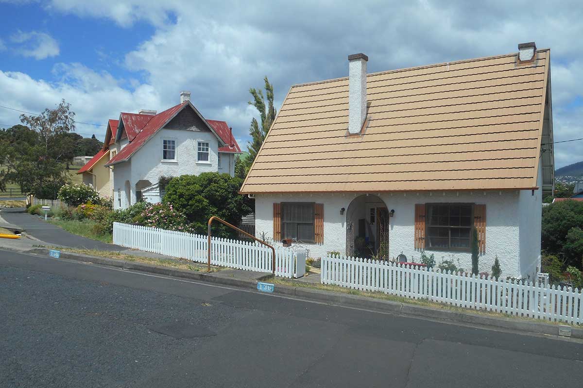 Located on the hillside above the Brooker Inn, this quaint enclave of Arts and Crafts stucco rendered concrete, weatherboard and brick houses are today some of the most distinctive and significant buildings in Tasmania, and are rare examples of early twentieth century English-style company housing in this country.
