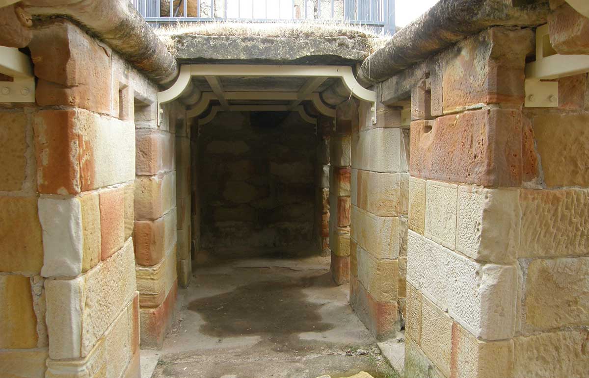 At the site are remnants of the main settlement including the prisoners' barracks, chapel, officers' quarters and solitary cells. The ruins of the colliery, including the circular depressions of the mine shafts, can be viewed at close range. On the slopes above are the ruins of the military officers quarters and the remains of several stone cottages near Plunkett Point. The Underground Cells, which were restored in 1977, must surely be one of the most horrific examples of penal life anywhere in Australia. They are totally without light, the air is fetid, they are small, harsh and inhospitable.