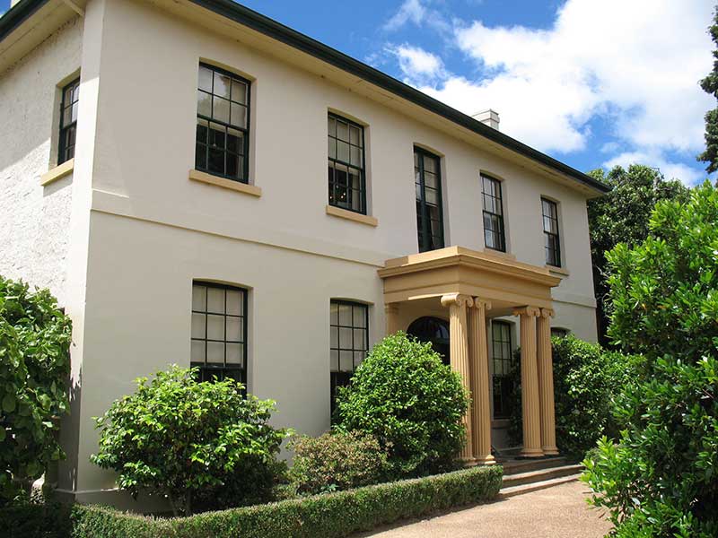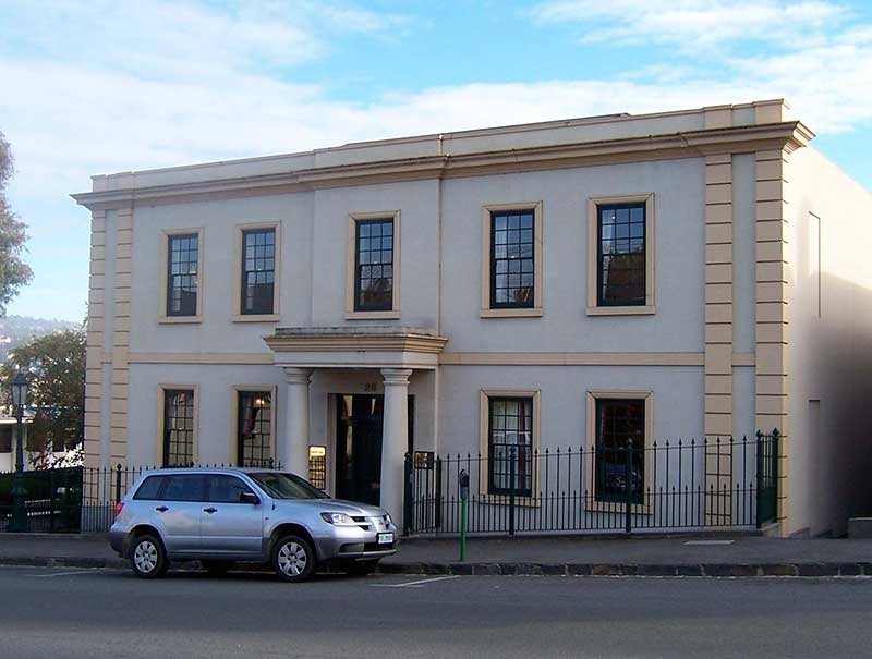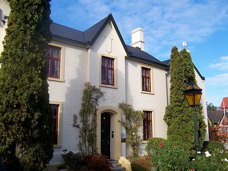 1838-39 - An excellent example of a two storey Regency house built 'on spec' for Britton Jones, an early Launceston brewer and innkeeper in 1838-9. A feature of the building is its scholarly Ionic porch. The house was purchased by the National Trust in 1960, restored and opened to the public in 1961. It is a large, classic Georgian house of brick and stucco. It features a main hipped roof, projecting eaves, 12 pane windows above, 15 pane below. The front facade is stuccoed and has string courses between two levels.