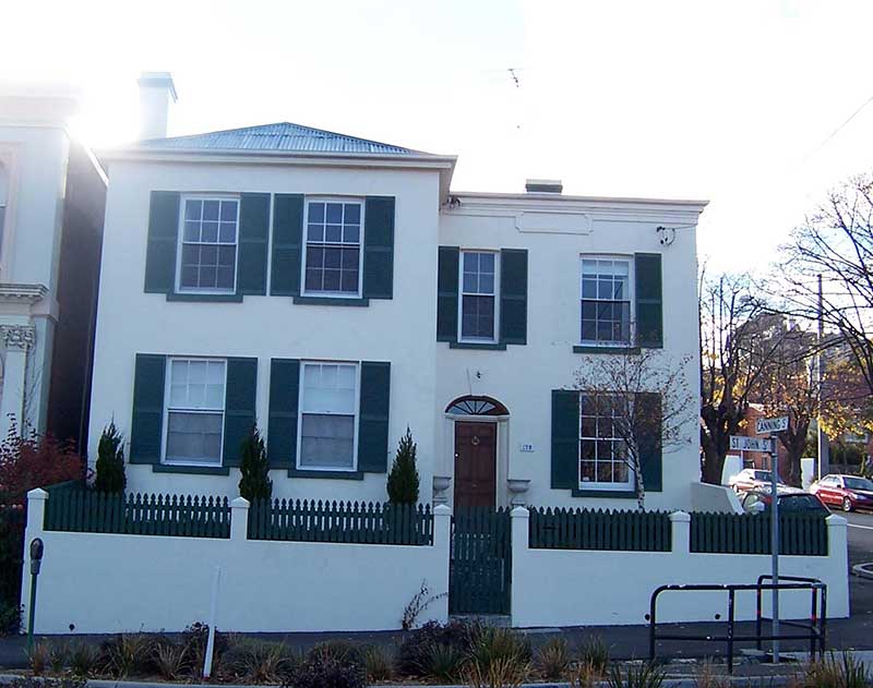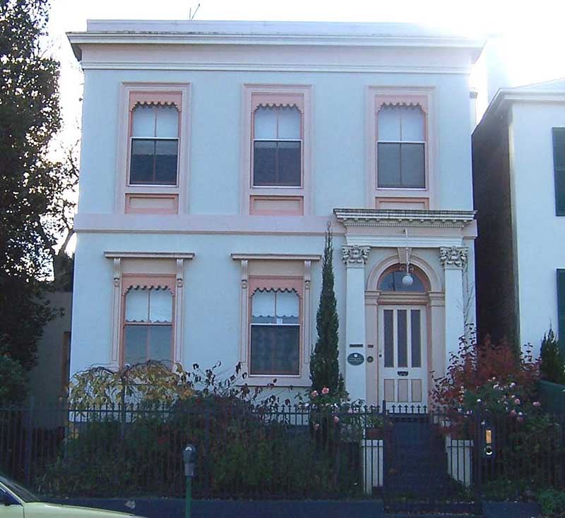 A fine example of a Victorian Italianate townhouse built in the 1860's, still freestanding and located in the central area of Launceston. It was once used by The Masonic Club. The roof is hipped and concealed by a plain corniced parapet. The building is of brick with a stuccoed facade, with vermiculated quoins at corners and a plain string course between levels. The upper level is plain stucco with windows having moulded surrounds and recessed panels below. The lower level is of imitation rusticated ashlar. Windows have decorative voussoirs and vermiculated keystones. The front door (five panelled) has a simple moulding and bracketed pediment. The northern wing was probably a later addition.