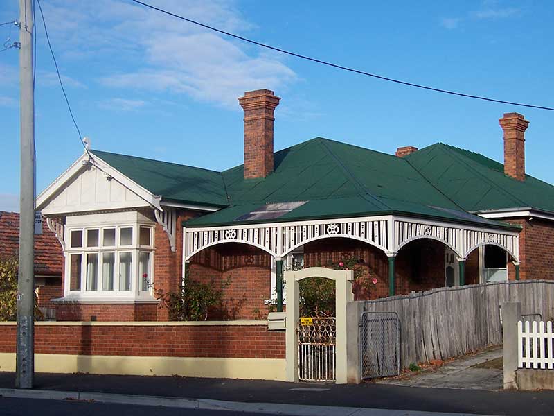 A modest Queen Anne style home built around the turn of the 20th century. It features tall brick chimneys, a corrugated iron roof, a rectangular bay window on the left side and a verandah on the right finished with an Arts & Crafts style frieze.