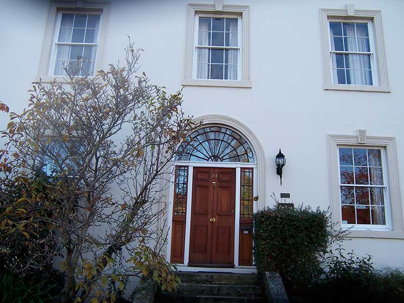 A fine symmetrical two storey Georgian townhouse with Classical influences. Built of brick and stucco, with stone quoins, it features a main hipped roof, a central front door and five 16 pane windows above, four below. The entrance portico has entablature and cornice supported on paired columns.