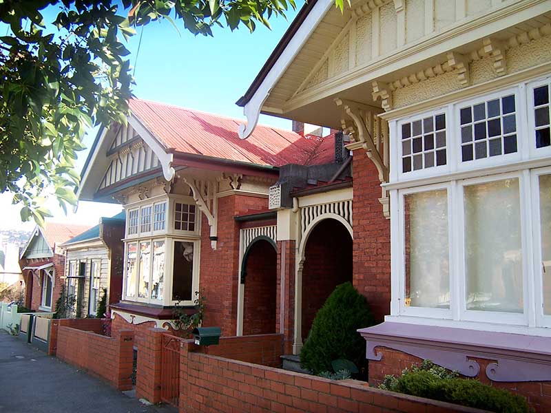 A splendid row of two storey terrace houses, which provide an interest contrast to the less elaborately detailed Esk View Terrace houses on the opposite side of the street. Dorset Terrace features more finely detailed wrought iron filigree.