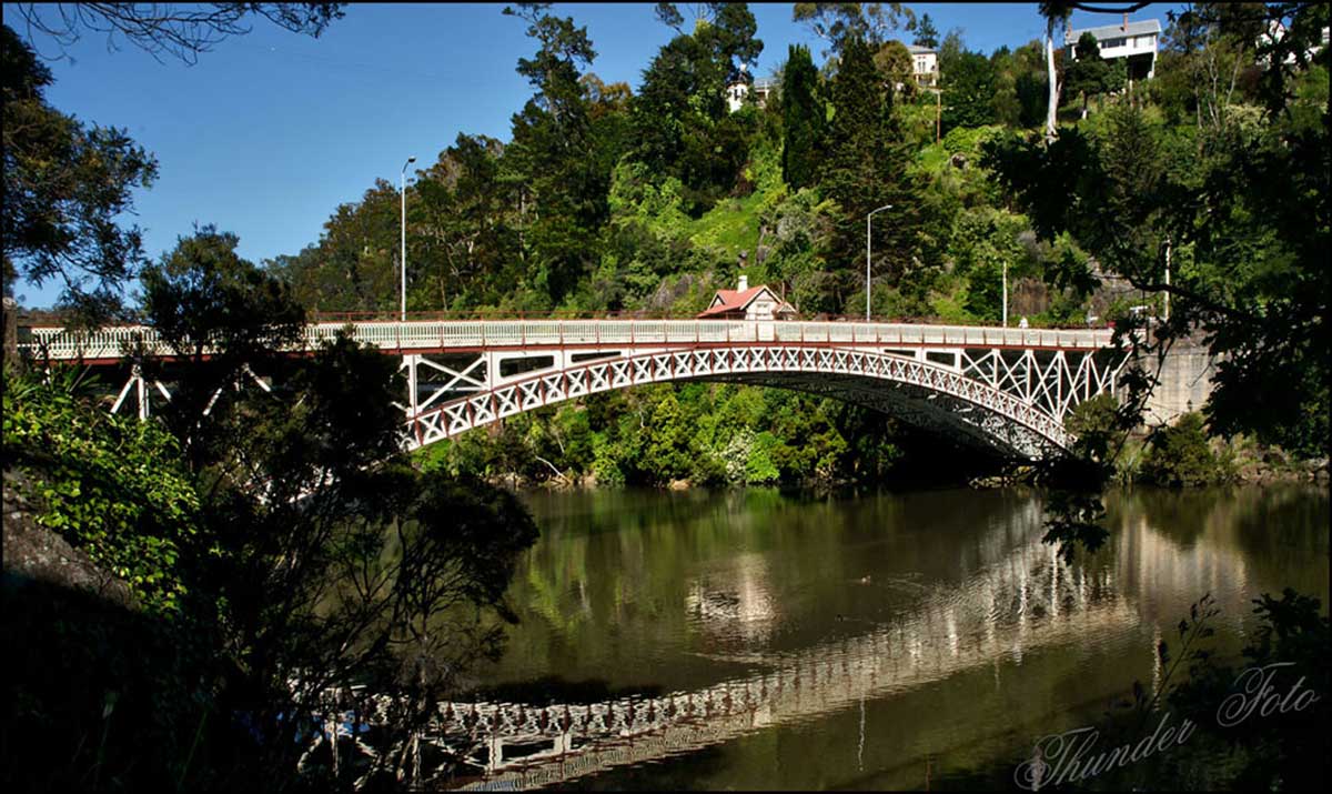 Completed in 1864 this beautiful wrought iron arch bridge with a span of 60 metres was designed by Engineer William Thoma Doyne. It was fabricated in Manchester, England, and transported to Launceston, assembled on a pontoon, floated into position then lowered on to its abutments on the receding tide. The bridge provided a vital link with the West Tamar Region. The duplicate adjacent span, fabricated by Salisbury's foundry in Launceston, was similarly erected and floated into position in 1904.