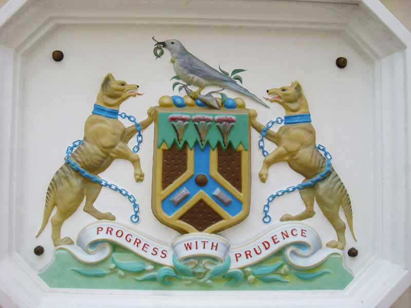 Plaque dispaying the city's coat of arms. Note the ironically chained thylacines (Tasmanian tigers - systematically hunted to extinction by humans) on the left and right.