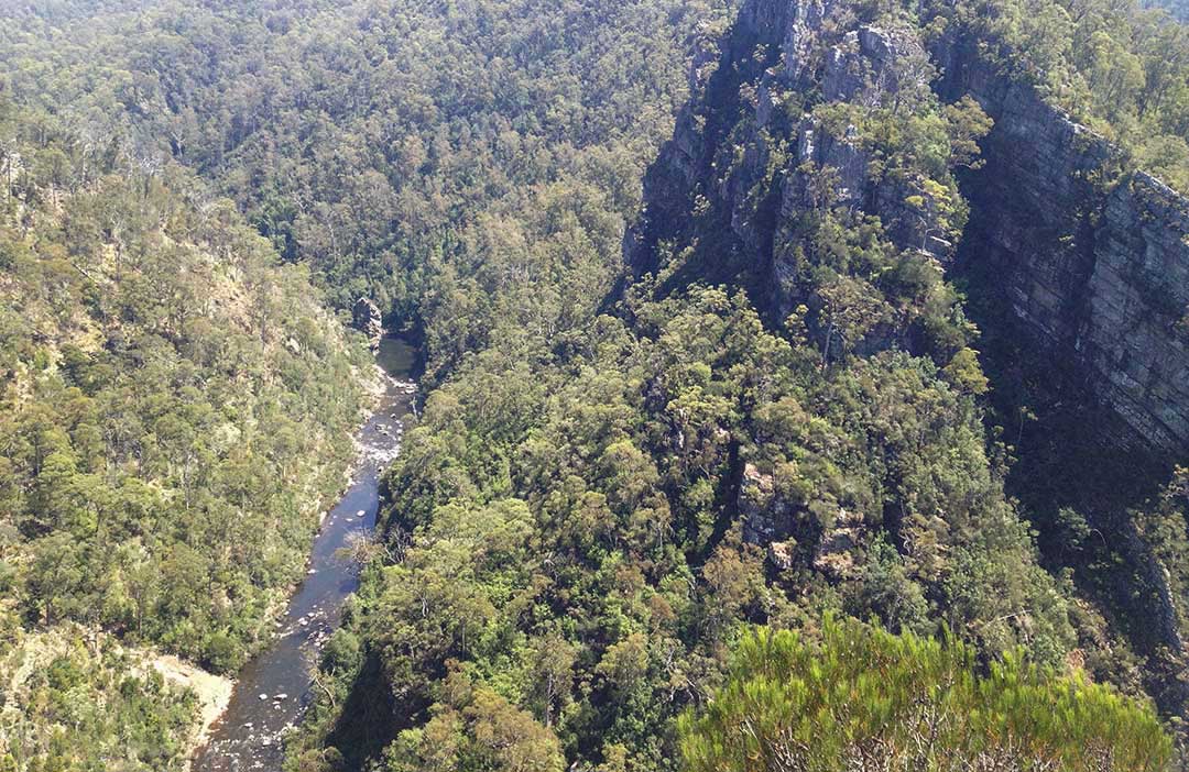 It is a short walk from the car park to a forest lookout perched high above the Mersey River. Here, in the heart of the Great Western Tiers, the river flows along the valley through the Alum Cliffs Gorge. Tulampanga, or Alum Cliffs, was a place of particular social and spiritual significance to Aborigines because of the ochre to be found in that area of the Gog Range. Many tribes travelled to Tulampanga to obtain this highly prized material and for them this was a sacred celebration place.