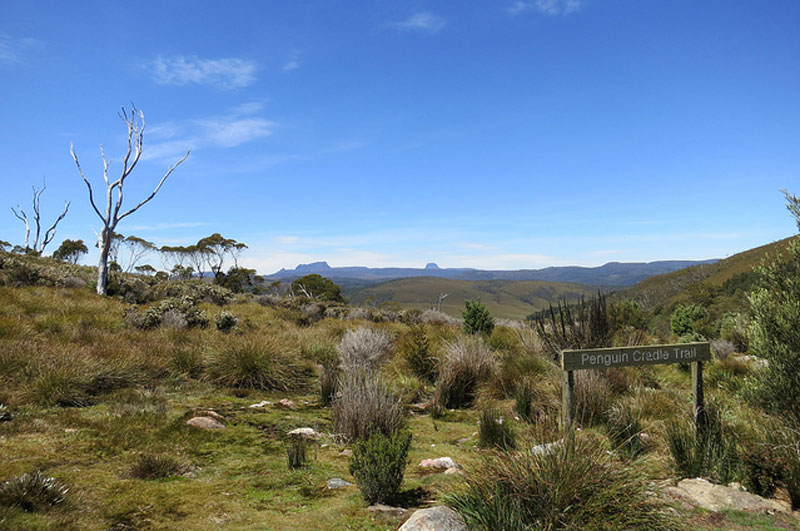 For those seeking to stay in the vicinity of Cradle Mountain but with less people around than the Overland Track and a more challenging bushwalk, the Penguin Cradle Trail is an attractive aternative. The complete walk is over a distance of 76km, and it is recommended that a party allow five to seven days for the trip. The Trail starts at the coast at the town of Penguin, and takes you though some rural areas and much seemingly untouched open woodland and rainforest. Combine these with rugged mountain ranges, a canyon with a wild river running through it and some idyllic lakes with vistas of snow capped peaks. Add waterfalls, ancient conifers, wildflowers and clean water and the purest air in Australia, and you have a bushwalk featuring some of the best experiences available in Tasmania.