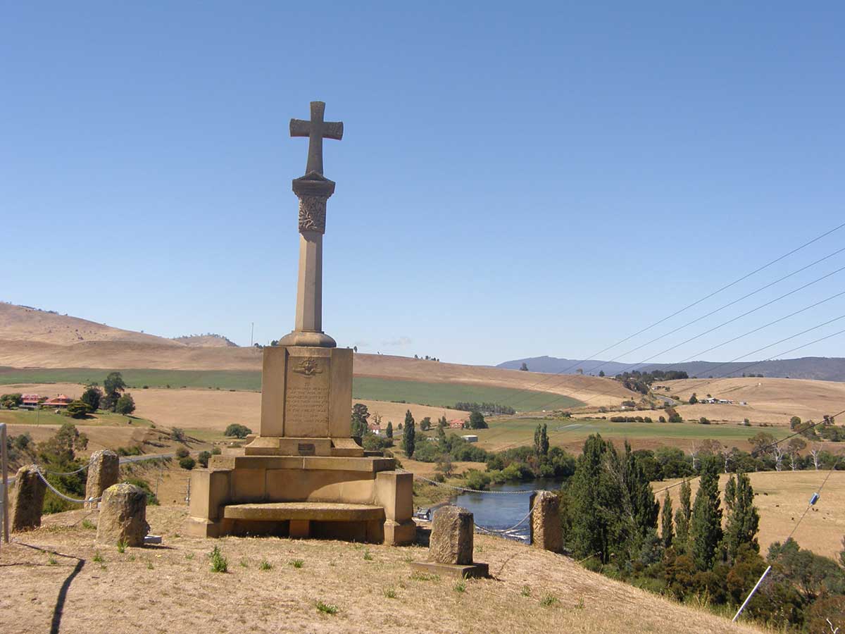 A tiny village on the River Derwent, Gretna was formerly known as Macquarie Plains. Gretna is home to one of Tasmania's most memorable monuments, a memorial to the Hamilton district's 22 fallen soldiers of The Great War (1914-18). Perched on a hill on the side of the Derwent, Gretna's memorial was built by Mrs A Walker of Clarendon to remember her nephews - Guy Davenport and Arthur Davenport - who were killed in the war. The memorial sits prominently at the southern entrance to the village. It also contains a plaque which was added for the 75th anniversary of Armistice Day.
